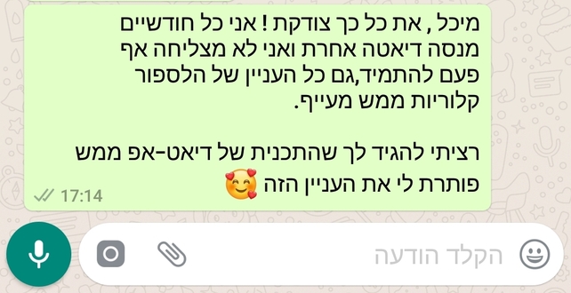 לא ידעתי כמה לשינויים הקטנים וטיפים מסויימים יכולים לגרום לי לרדת במשקל ומבלי להרגיש בכלל שאני עושה דיאטה. תמיד שאני עושה דיאטות אני מרגישה עינוי וחוזרת לאכול עוד יותר ממה שאכלתי לפני. פעם ראשונה שיצא לי באמת להתמיד , עזבו להתמיד אני רואה בזה שינוי באורח החיים. דיאט אפ זו המילה האחרונה !